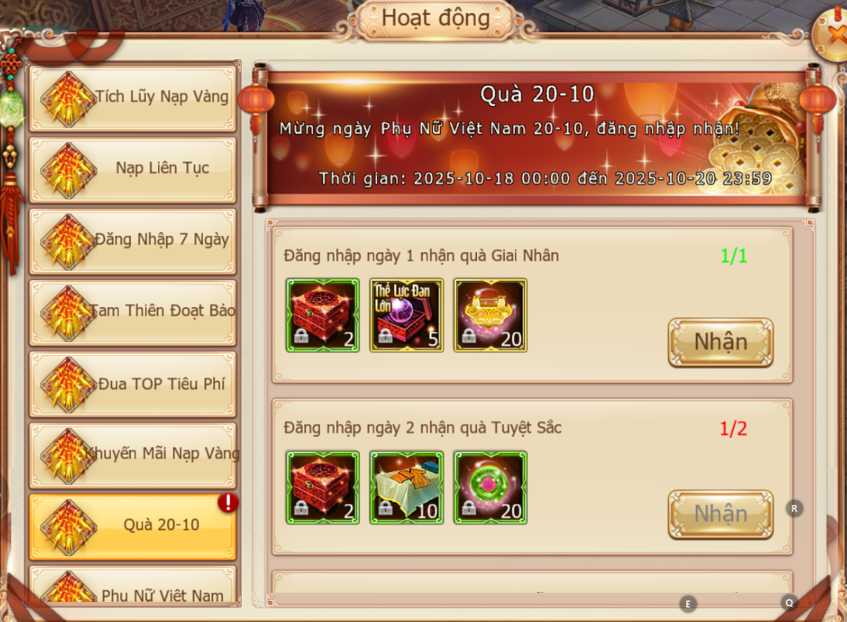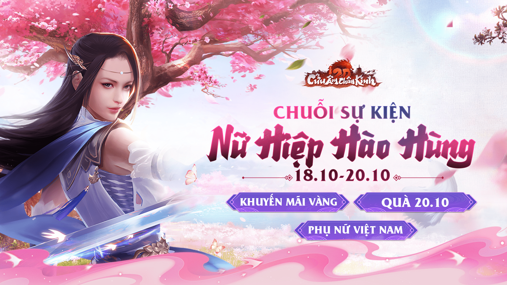 Đây là khoảng thời gian đặc biệt để tôn vinh những nữ hiệp tài sắc, những đóa hoa kiên cường giữa chốn giang hồ. Nhân dịp 20/10 – Ngày Phụ Nữ Việt Nam, chuỗi sự kiện “Nữ Hiệp Hào Hùng” chính thức khởi động – mang đến vô vàn quà tặng, ưu đãi và hoạt động đặc biệt dành riêng cho toàn thể Nhân Sĩ.
