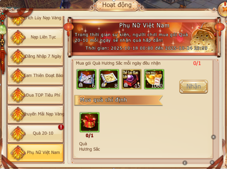 Trong thời gian sự kiện, người chơi mua gói Quà 20-10 mỗi ngày sẽ nhận quà hấp dẫn!
