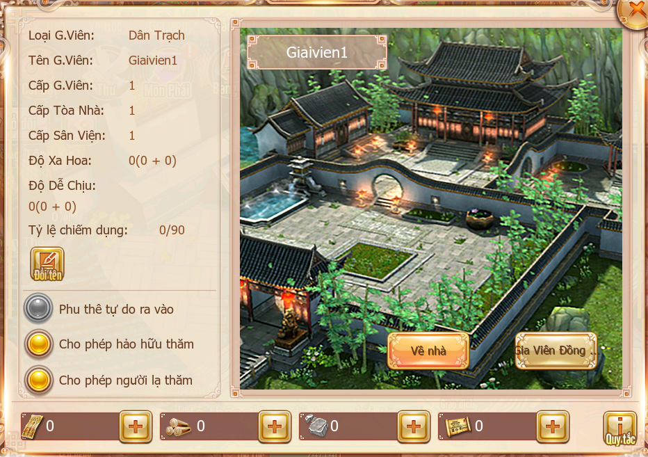 + Nâng cấp Gia Viên, Phòng Và Sân Viện ở các cấp độ khác nhau cần tiêu hao số lượng Ngân Phiếu, gỗ, đá và  bản vẽ kiến trúc khác nhau.