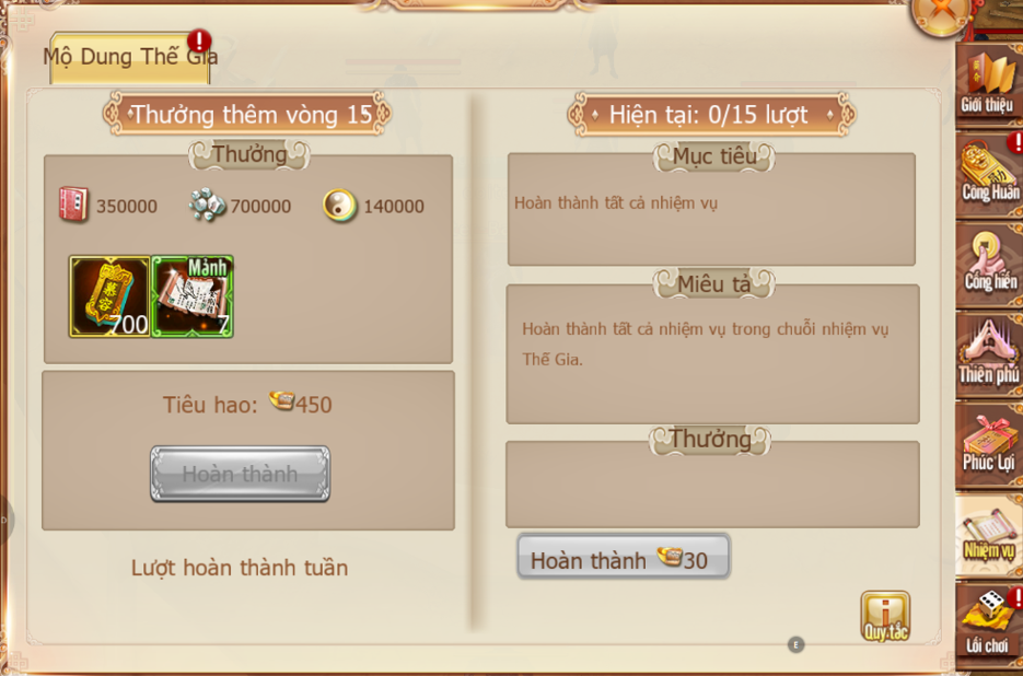 - Mỗi vòng nhiệm vụ Thế Gia gồm 15 lượt, hoàn thành toàn bộ có thể nhận “thưởng thêm”