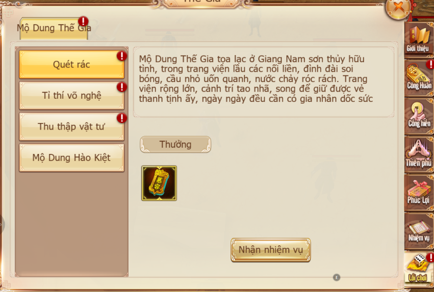 - Mỗi tuần mỗi Thế Gia có thể nhận 1 vòng nhiệm vụ Thế Gia