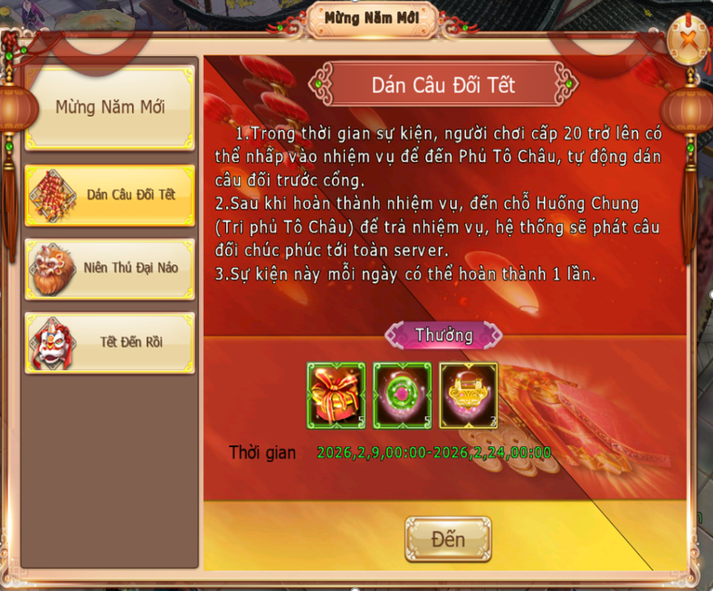 - Trong thời gian sự kiện, nhân vật đạt cấp 20 về Tô Châu đến gặp NPC Lâm Thiên Nam nhận nhiệm vụ "Dán câu đối tết"