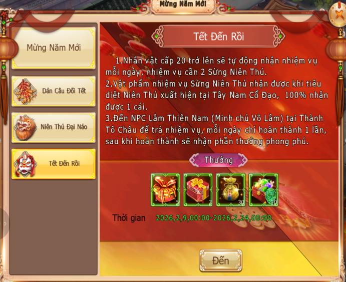 - Trong thời gian sự kiện, nhân vật đạt cấp 20 về Tô Châu đến gặp NPC Lâm Thiên Nam nhận nhiệm vụ "Tết đến rồi"